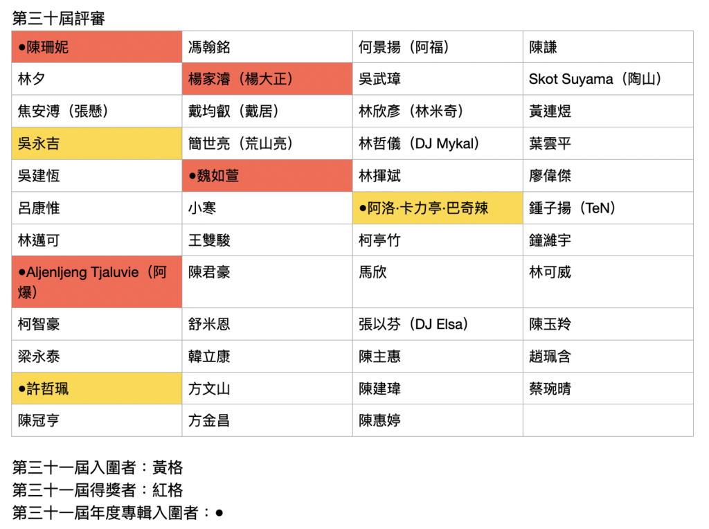 在頒獎之前就有提到這件事,會後特地列表來對照,才發現真是太多了吧,不意外三十屆結果會那樣,評審很多都是創作第一,唱功其次的創作歌手。